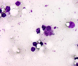 原発巣を評価する検査として、細胞診検査があります。 細胞診とは、細い針を用いて、しこりの一部の細胞を採取します。 その細胞を顕微鏡で見て、悪性・良性・その他を検討し、悪性ならばどういった種類なのかを予測します。